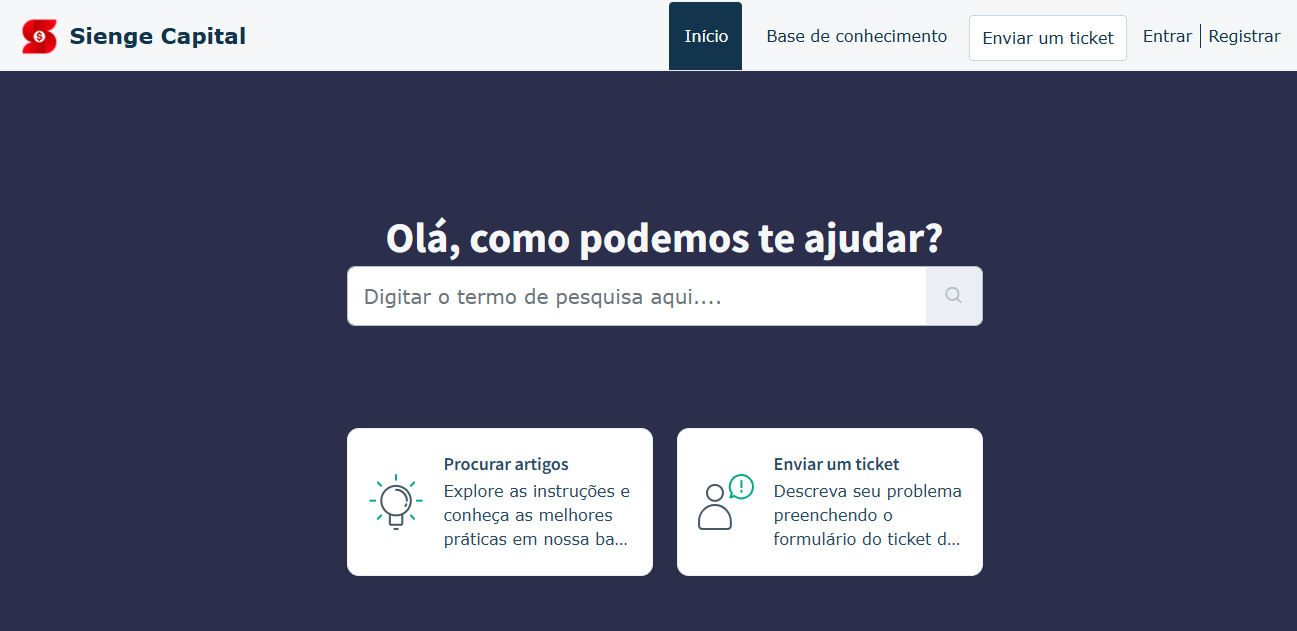 Ao digitar o caminho do portal: https://ajuda.siengecapital.com.br/, você visualizará a seguinte tela: