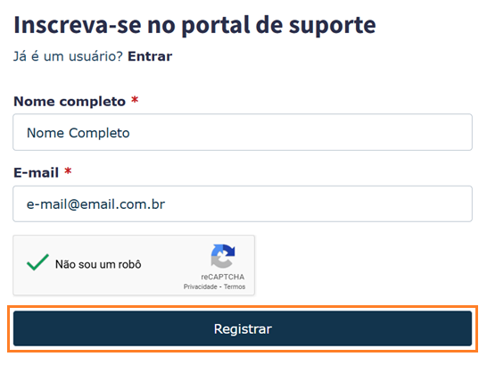 Ao clicar no botão Registrar será direcionado para criação de usuário do qual deverá preencher seu nome completo e e-mail, após autenticação reCAPTCHA clique em Registrar no final do formulário.