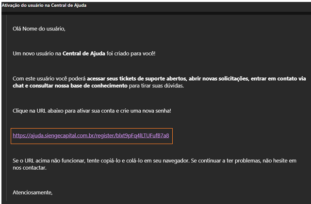 Após a solicitação de registro, o usuário receberá um e-mail do Suporte Sienge com o link para ativação da conta, como indica a imagem abaixo:
