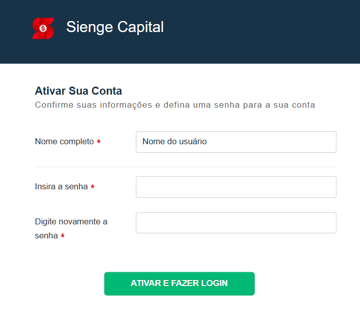 Nela você irá inserir uma senha, confirmar a mesma e clicar em Ativar e Fazer Login. Neste momento você será direcionado para o portal, já logado.