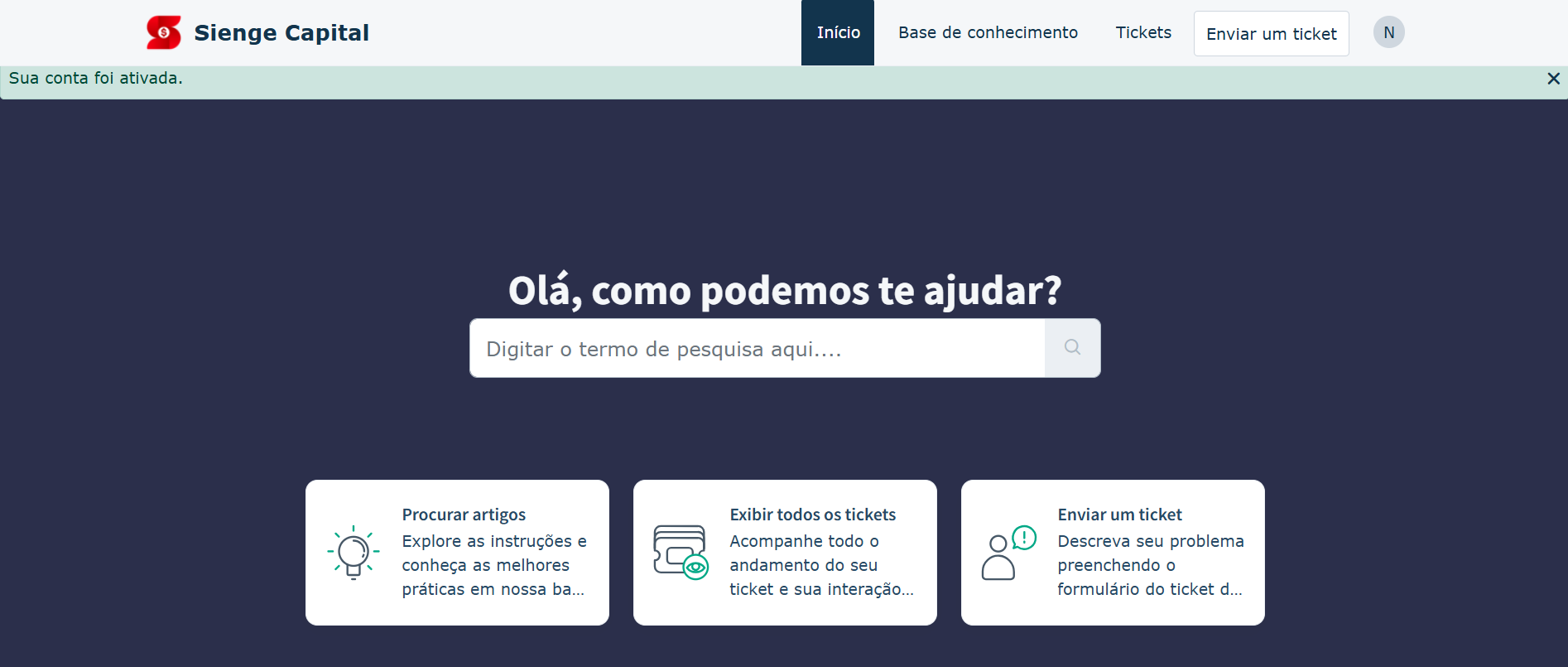 Logado no sistema, você visualizará o portal com todas as suas funções: Base de Conhecimento para consultar os artigos, Criação de Tickets - através do botão Enviar um Ticket e consultar seus Tickets - acessando tanto pelo botão de Tickets como Exibir todos os tickets.