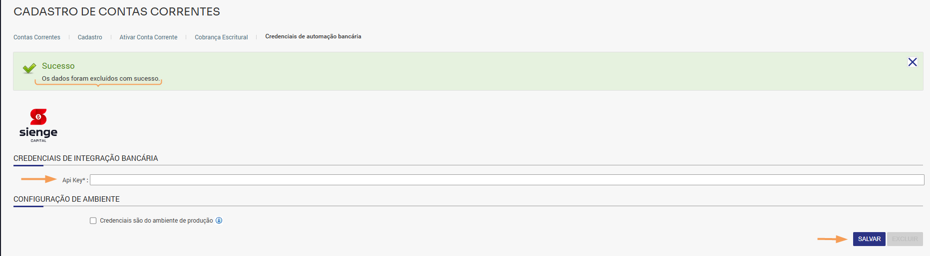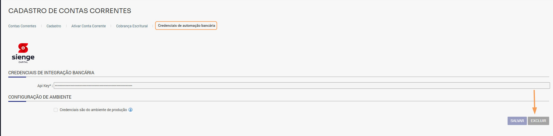 Pesquise pela conta desejada, clique em Editar, e na aba Credenciais de automação bancária, exclua a configuração antiga clicando no botão Excluir.