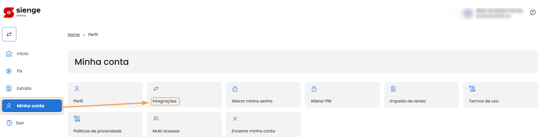 1- No aplicativo/internet banking no menu de navegação, acesse o caminho: Minha Conta > Integrações.