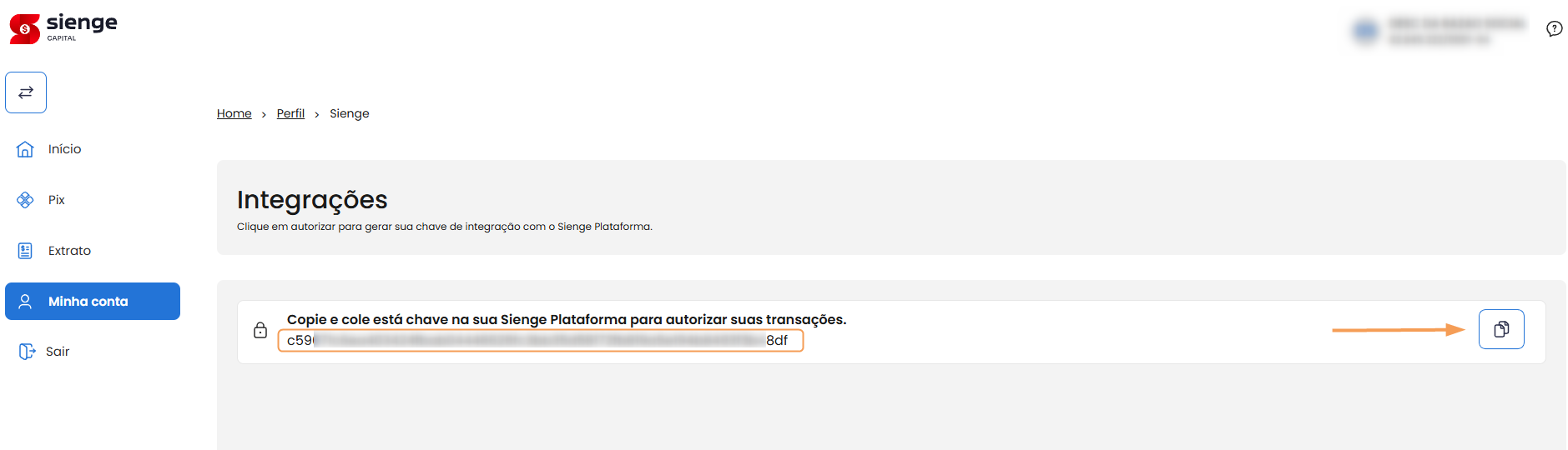 Atenção! Sempre que uma nova desativação e reautorização for realizada, é necessário copiar a nova chave gerada e inserir no Sienge Plataforma.Isso garante que a comunicação entre os sistemas continue funcionando corretamente.