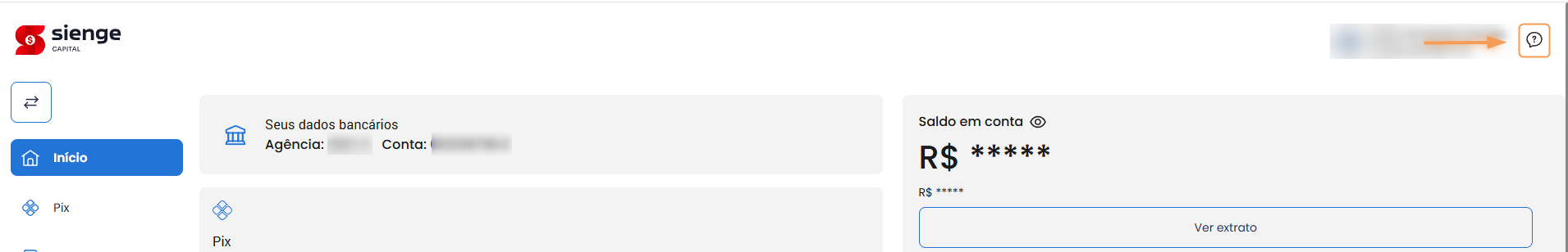 1- Abra o aplicativo ou o internet banking da sua Sienge Conta. No canto superior direito, ao lado do nome da empresa, clique no ícone de ajuda: